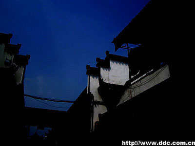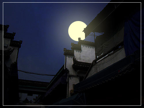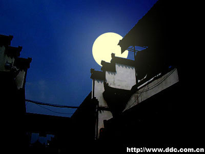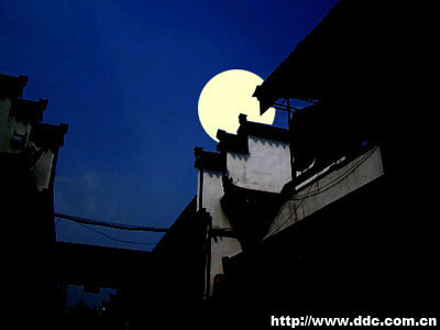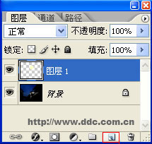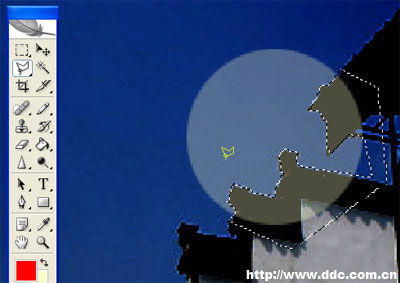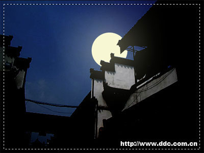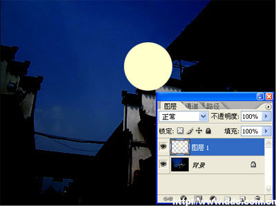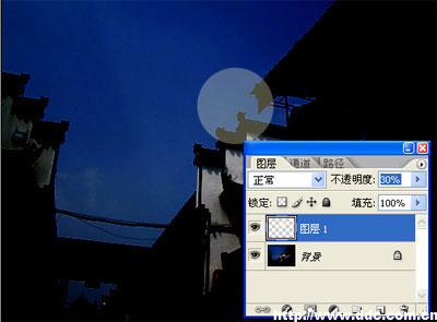 3、调整这个图层的透明度为30%。使用多边形套索工具制作出与月亮交叠的房檐部分的选区。