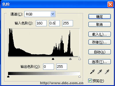 1、首先photoshop中打开原图,然后使用菜单中的[图像/调整/色阶]命令(Ctel+L)。 这时会弹出一个对话框,在数值中依次填入“160、0.6、255”然后确定。这个时候图片的基本效果就出来了。