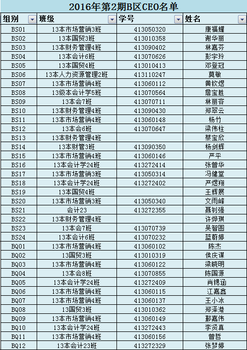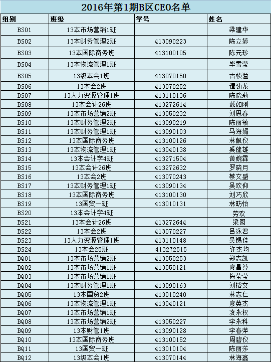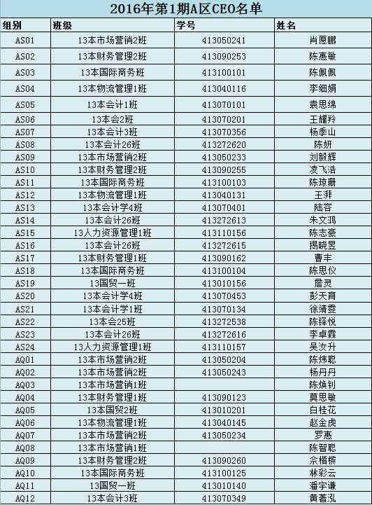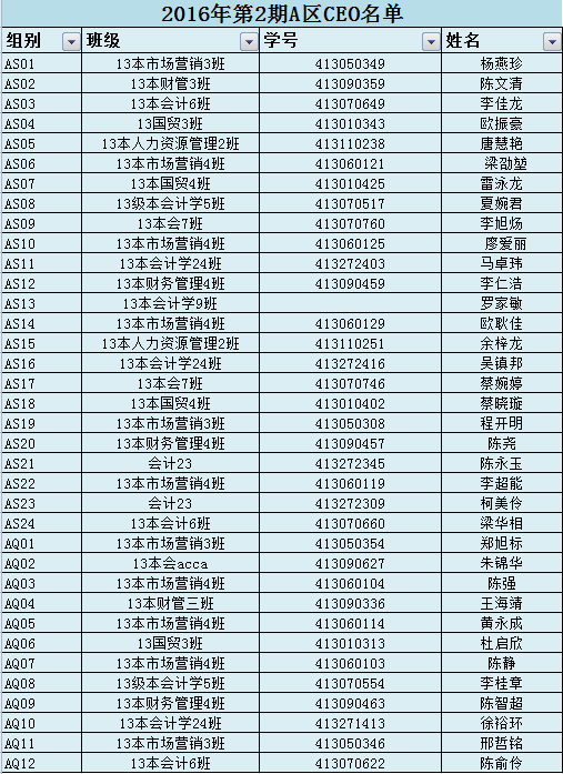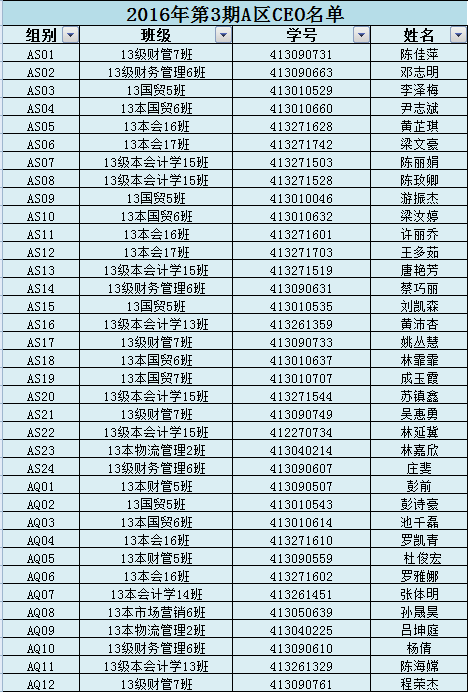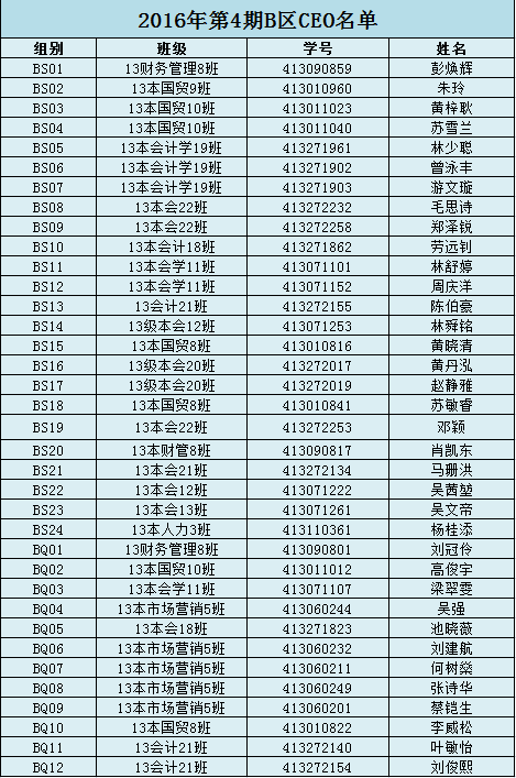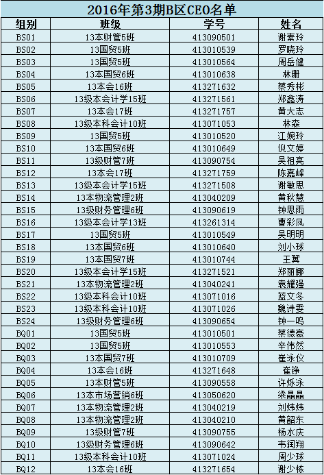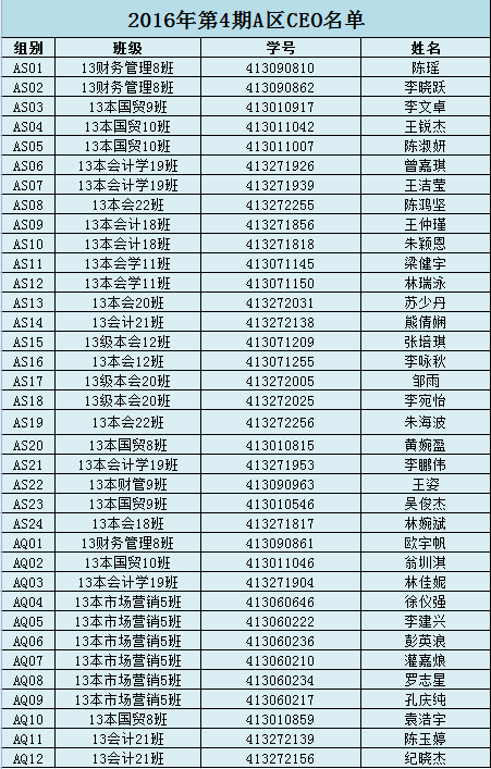 我中心本着“公平、公正、公开”的原则,为发现和培养更多的优秀人才,广泛选拔德才兼备的优秀学生充实到经管学科跨专业仿真综合实习平台中来,经过报名、面试并讨论决定,现将2016年第1-4期CEO名单公布如下。