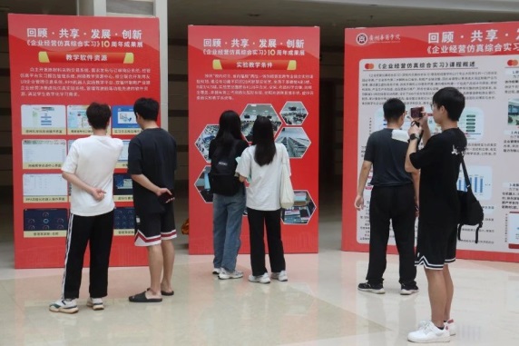 在董事长和校领导的关心和支持下,课程取得了广东省教学成果奖一等奖、广东省线下一流本科课程等一系列可喜成绩。展览的现场,一系列丰富多样的展板陈列在图书馆大厅,内容丰富,形式多样,全面回顾《企业经营仿真综合实习》10年的发展历程、教学理念和数字化教学取得的创新成果。